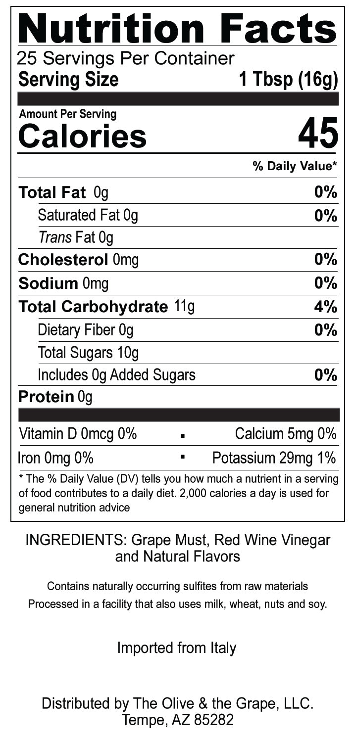Our balsamic vinegar is reduction balsamic vinegar, also known as balsamic glaze, from Modena, Italy, and is made with wine vinegar and grape must (crushed Trebbiano and Lambrusco grapes). None of our balsamic vinegars contain any added sugar; the sugar in our balsamic comes from grapes. Balsamic vinegar does not require refrigeration. Refrigeration can cause condensation to form inside the bottle, which can dilute the flavor. The best way to store balsamic vinegar is in a dark, dry place, such as a dark cupboard or pantry, at room temperature. It is best to keep bottles away from heat sources and avoid extreme temperature fluctuations. To learn more visit our FAQ page.