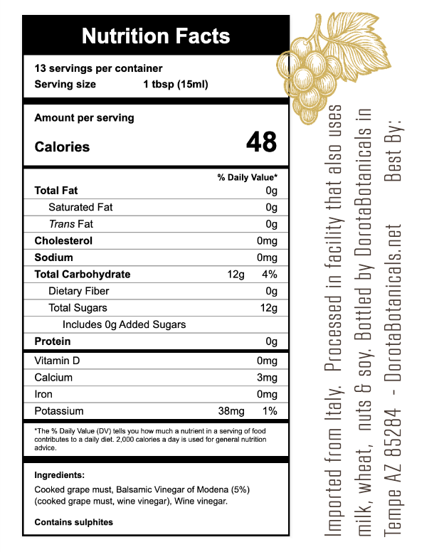 Ingredients: 90% aged balsamic grape must, 10% unaged wine vinegar Cooked must of Trebbiano and Lambrusco grapes